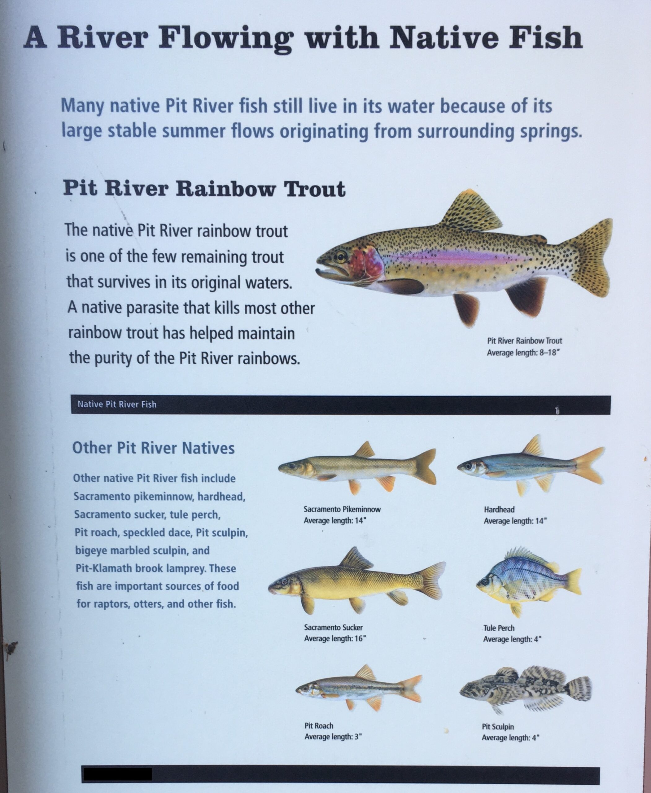 The ancestral origins of the rainbow trout in the Pit River remain unclear. These phenotypically unique trout are often referred to by the angling public as “Pit River rainbows,” implying a different strain than coastal rainbow trout. Our surveys confirmed that many of the rainbow trout observed exhibited bright coloration along the lateral line and on the opercula (pink to purplish band, some with faint parr marks retained into adulthood), yellowish ventral coloration and orange markings (cutthroat slashes) under the lower jaw. These phenotypic expressions are generally associated with redband trout. Given the Pit River’s historical and/or present hydrolological connection to both the Goose Lake Basin (and, therefore, potential downstream movement of Goose Lake redbands) and the Sacramento River (and therefore, coastal rainbow trout invasions from the lower end of the system), it is possible that the trout observed in the system today represent some intermediate between one or more forms of redband trout and coastal rainbow trout. However, no definitive genetic studies have been performed to clarify this issue. Further genetic sampling and analyses of the rainbow trout present throughout the Pit River system is recommended to elucidate the phylogenetic relationship(s) of rainbow trout in the Pit River to other trout forms in the greater Sacramento Fish Province. (From Pit River Summary Report July 2008 by Heritage and Wild Trout Program & California Department of Fish and Wildlife)